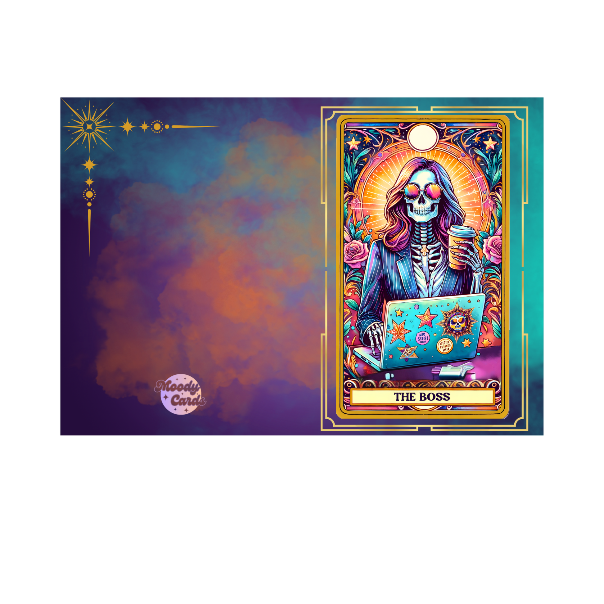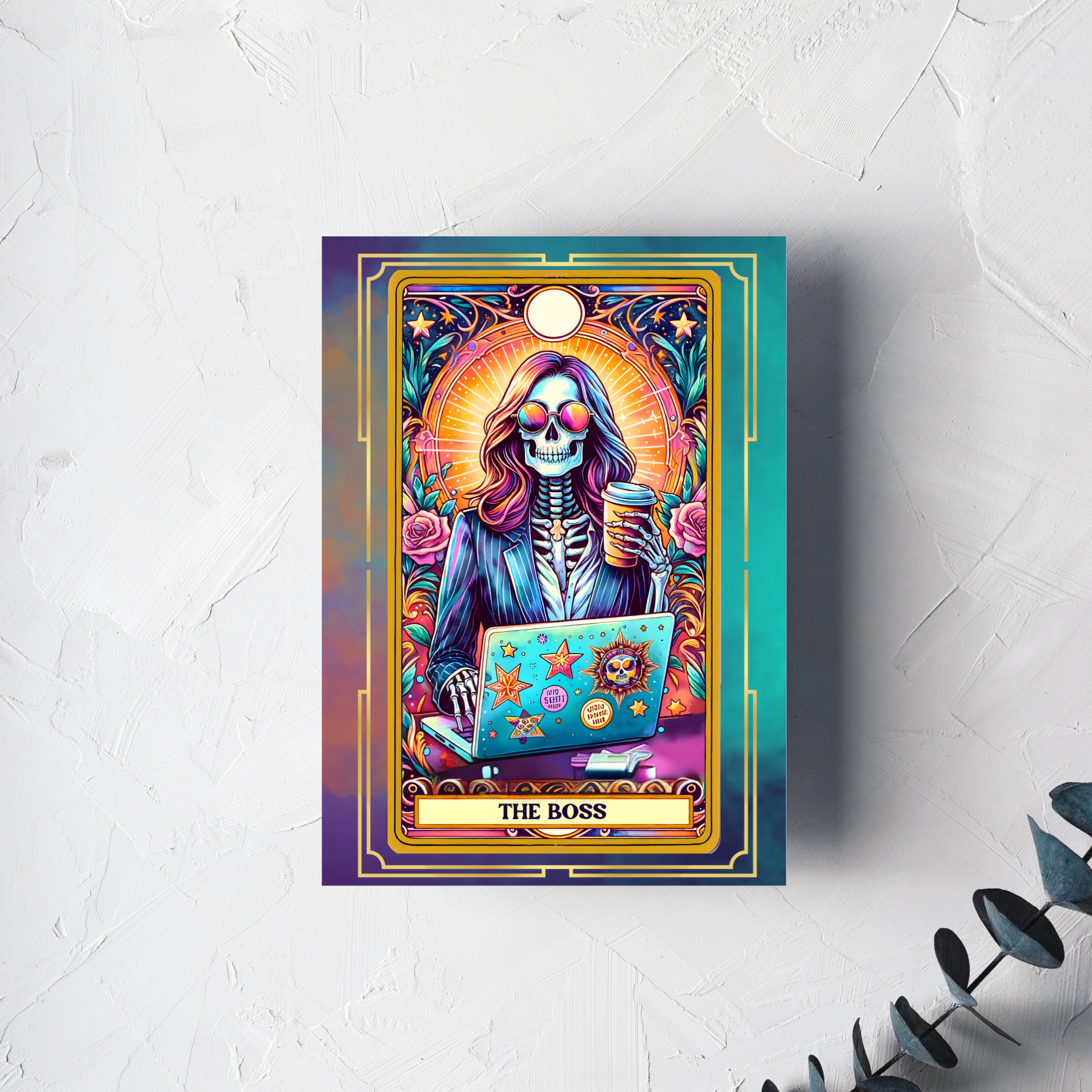 Celebrate the ultimate boss in your life with our empowering and humorous "The Boss" greeting card. This vibrant 5x7" card features a cool, confident skeleton figure in a stylish blazer and sunglasses, sipping coffee and working on a laptop. The laptop is adorned with fun, alternative stickers, and the scene is set against a bright, shining sun and a border of beautiful roses, giving it a powerful, tarot-inspired feel.