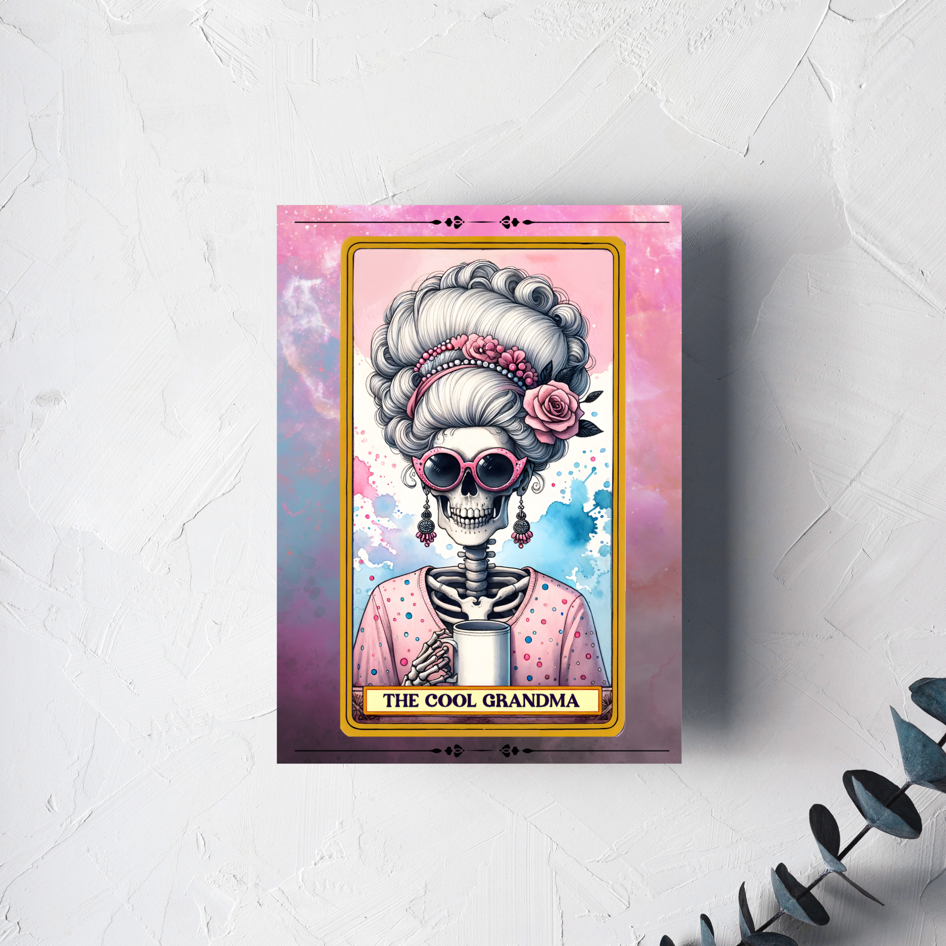 Celebrate the coolest matriarch you know with our empowering and humorous "The Cool Grandma" greeting card. This vibrant 5x7" card features a stylish skeleton figure with a fabulous beehive hairdo, a single rose, and a heart-shaped pair of sunglasses. She's dressed in a chic pink robe and is casually holding a coffee mug, all framed by an elegant, gold-trimmed border.