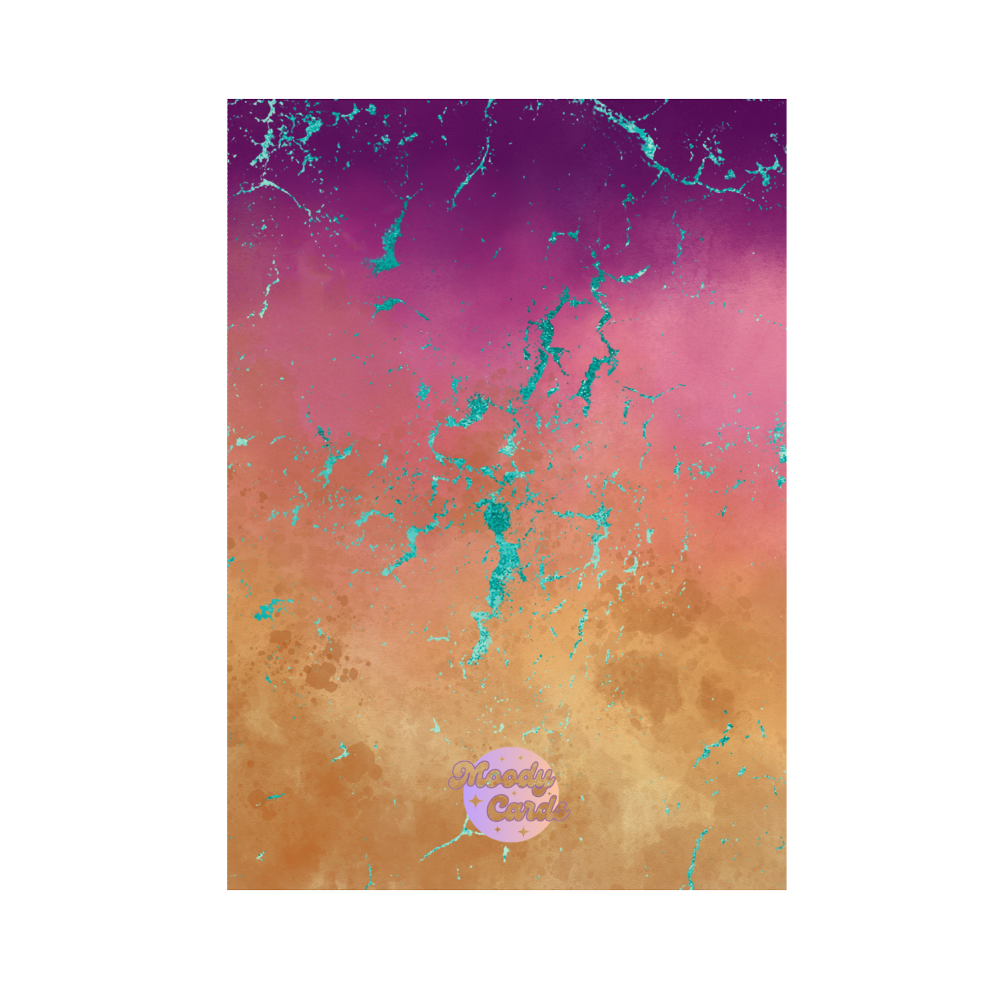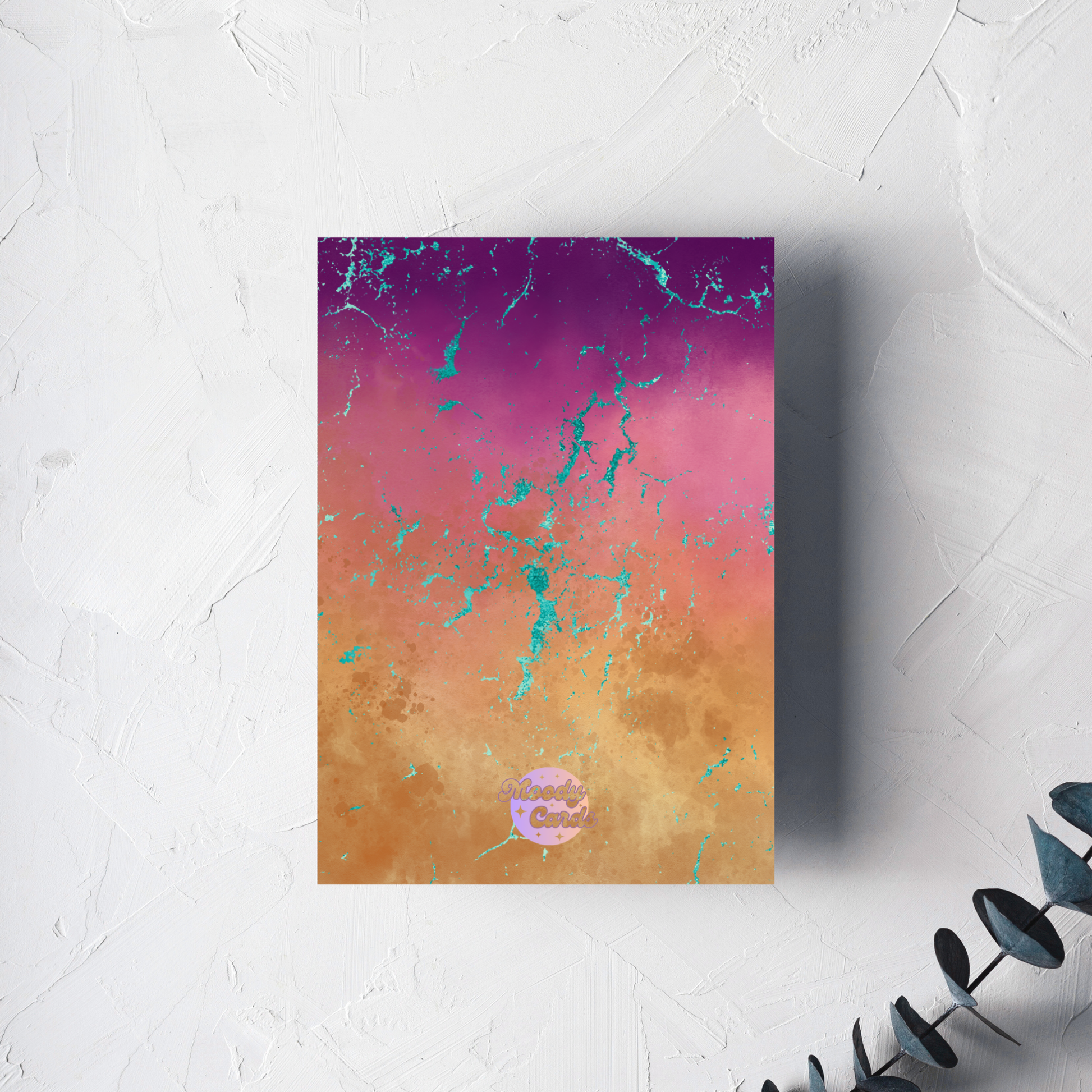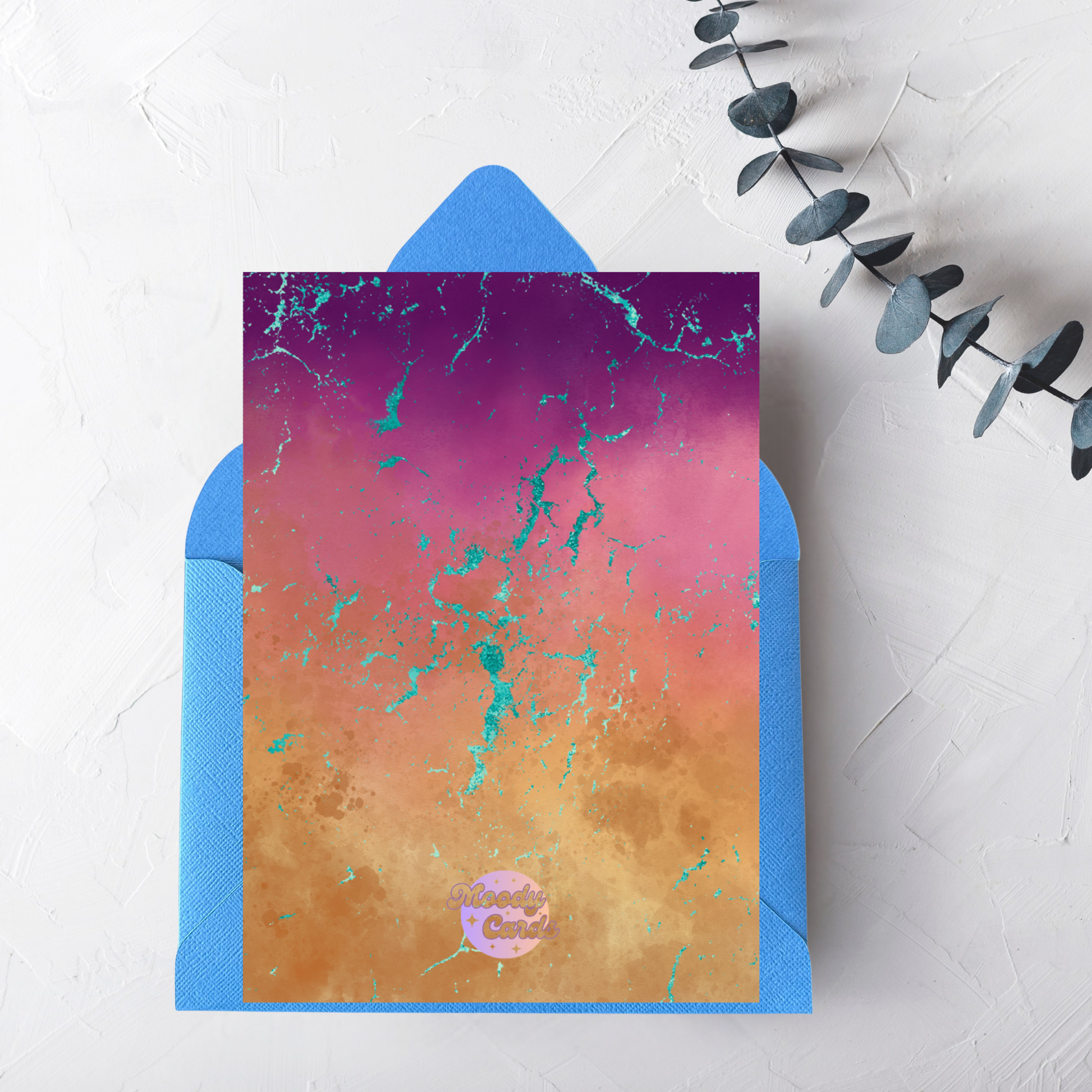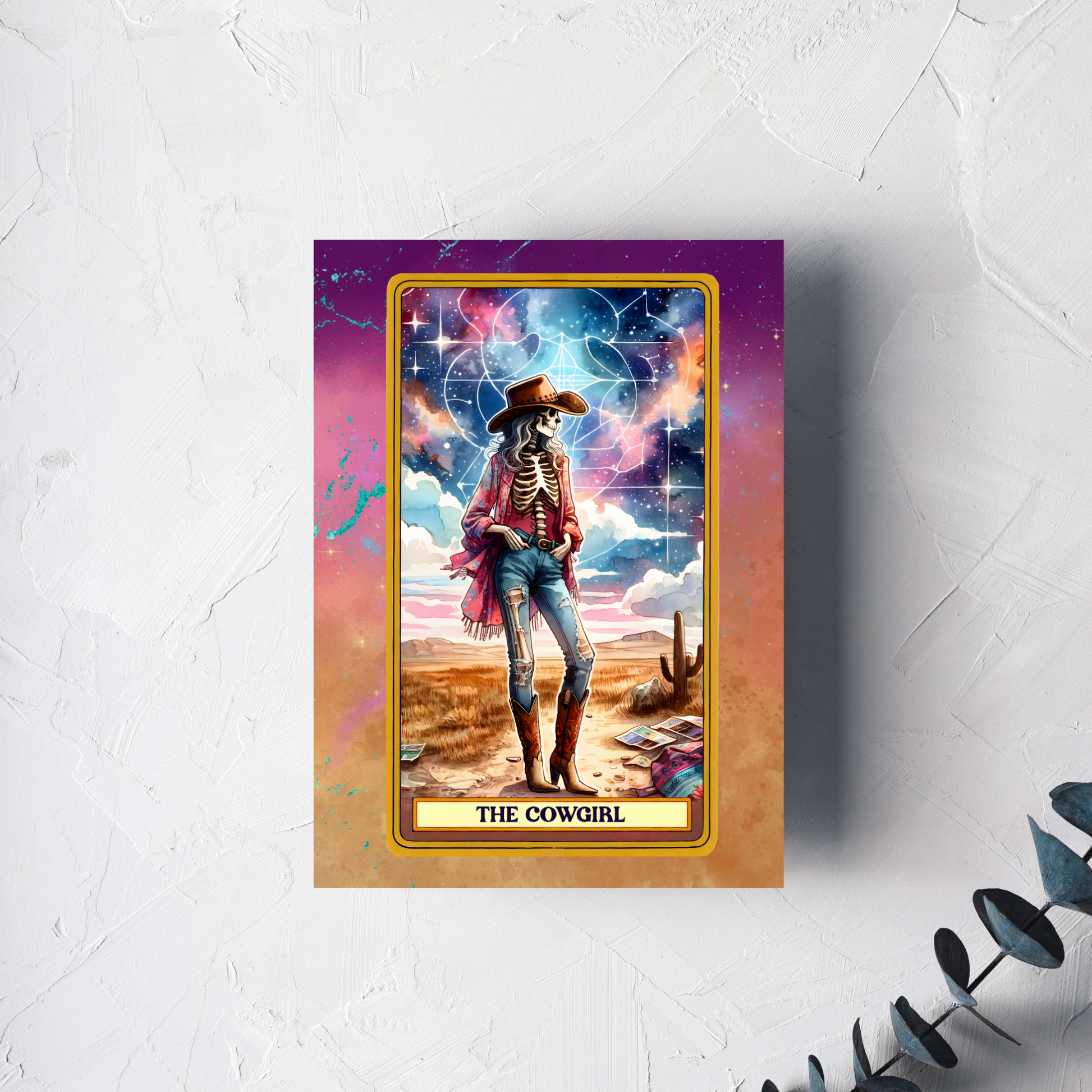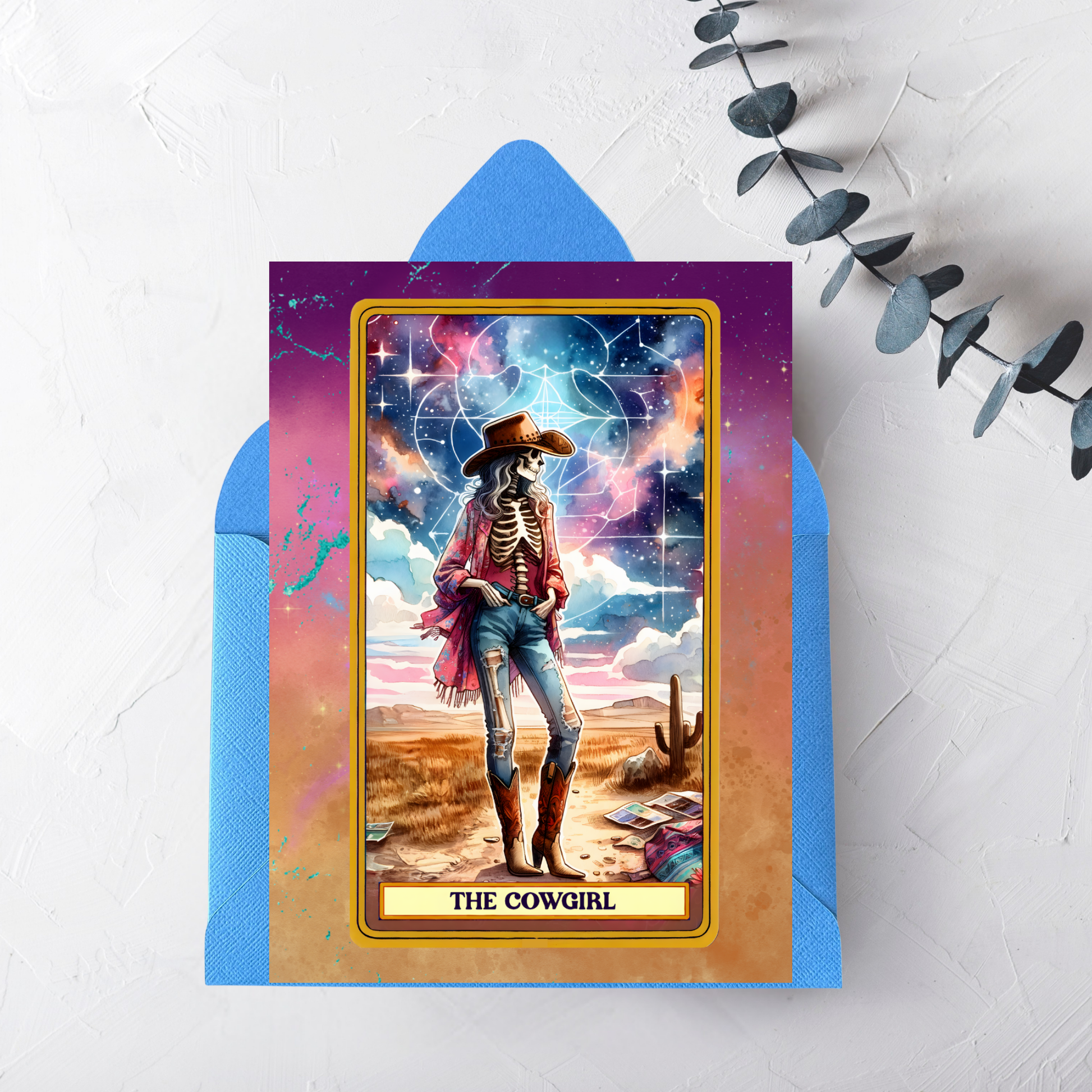 Ride into a new adventure with our enchanting "The Cowgirl" greeting card. This vibrant 5x7" card features a cool, confident skeleton figure dressed in a stylish cowgirl hat, a flowing jacket, and ripped jeans. She stands in a mystical desert landscape under a starry, cosmic sky, her presence both grounded and otherworldly. The entire illustration is a unique blend of Western style and magical realism, framed by an elegant, gold-trimmed border.
