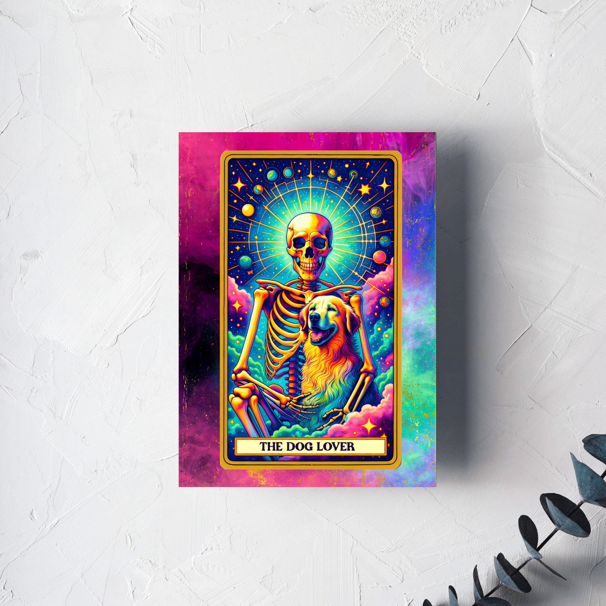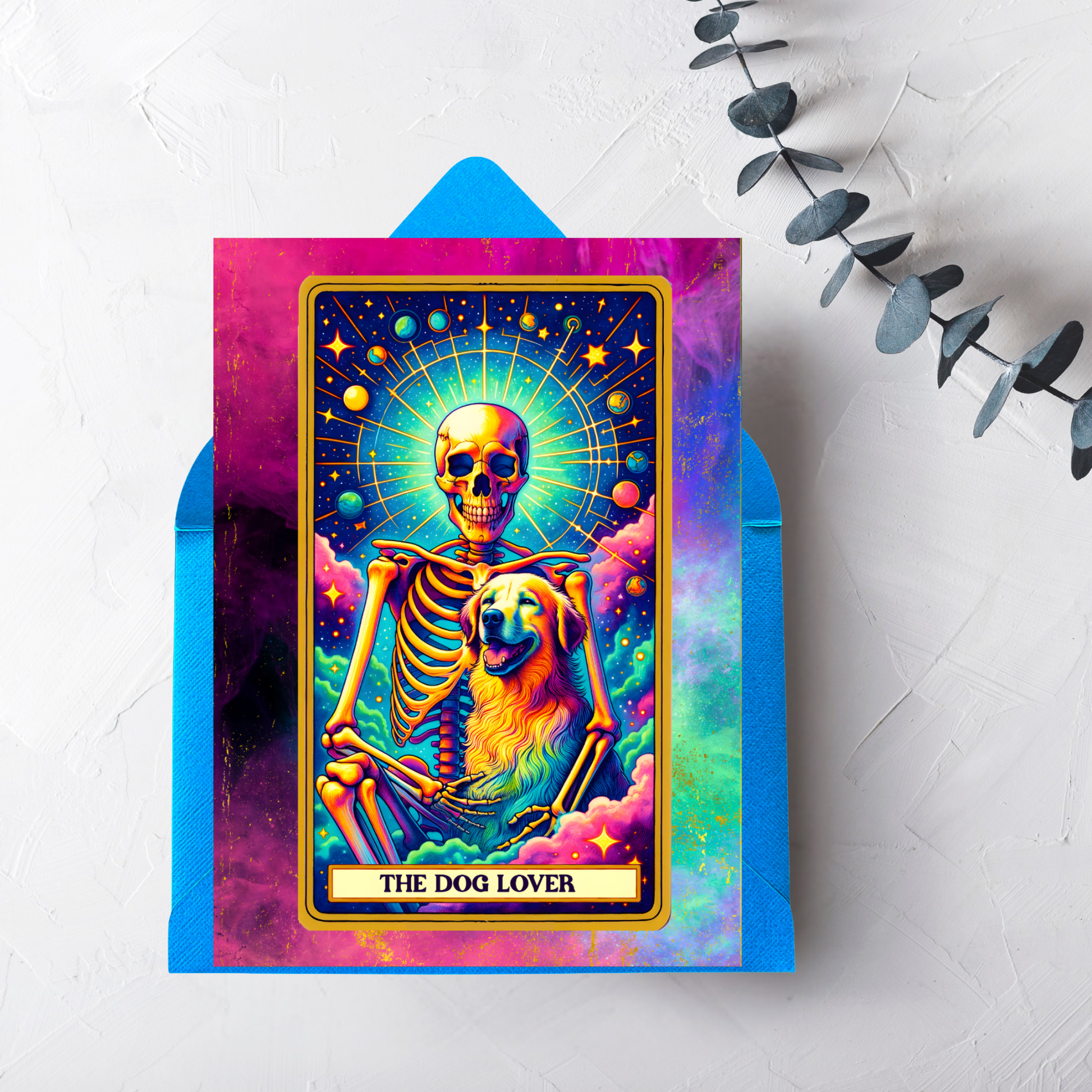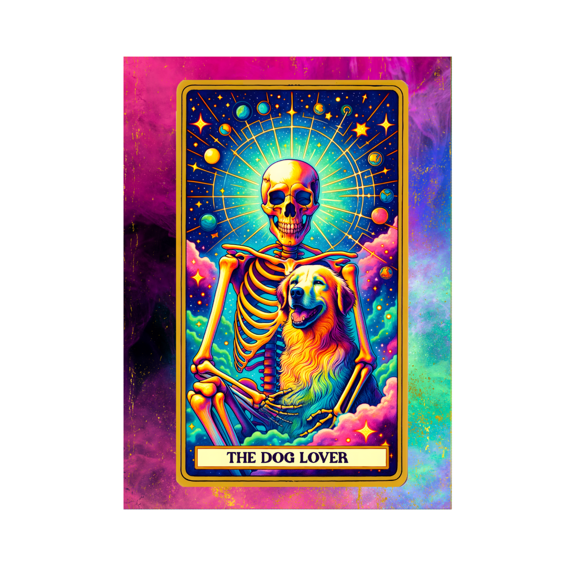 Celebrate the powerful bond between human and dog with our heartwarming and humorous "The Dog Lover" greeting card. This vibrant 5x7" card features a joyous skeleton figure lovingly holding a fluffy golden retriever, surrounded by a magical halo of starlight and vibrant, colorful clouds. The entire scene is a unique blend of the macabre and the modern, with a bold and beautiful message of unconditional love.