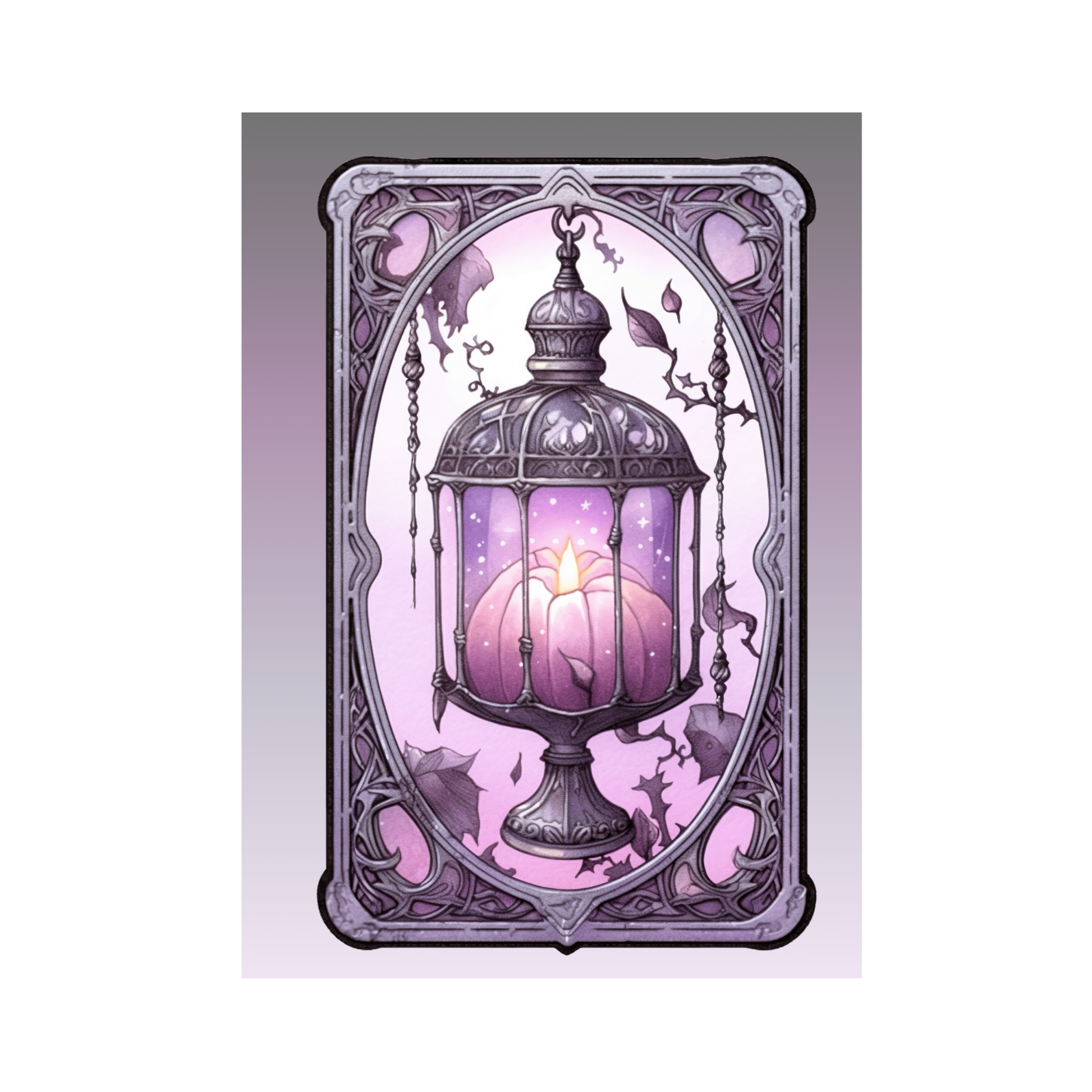 Light a magical path for a loved one with our enchanting Haunted Lantern greeting card. This captivating 5x7" card features a beautiful, gothic-inspired lantern, hanging from ornate chains. Inside the glass panes, a glowing, pumpkin-like flame illuminates a world of stars, while bats and twisted vines cling to the outside. The design is framed by a stunning, vintage-inspired border, with a soft, ethereal background.