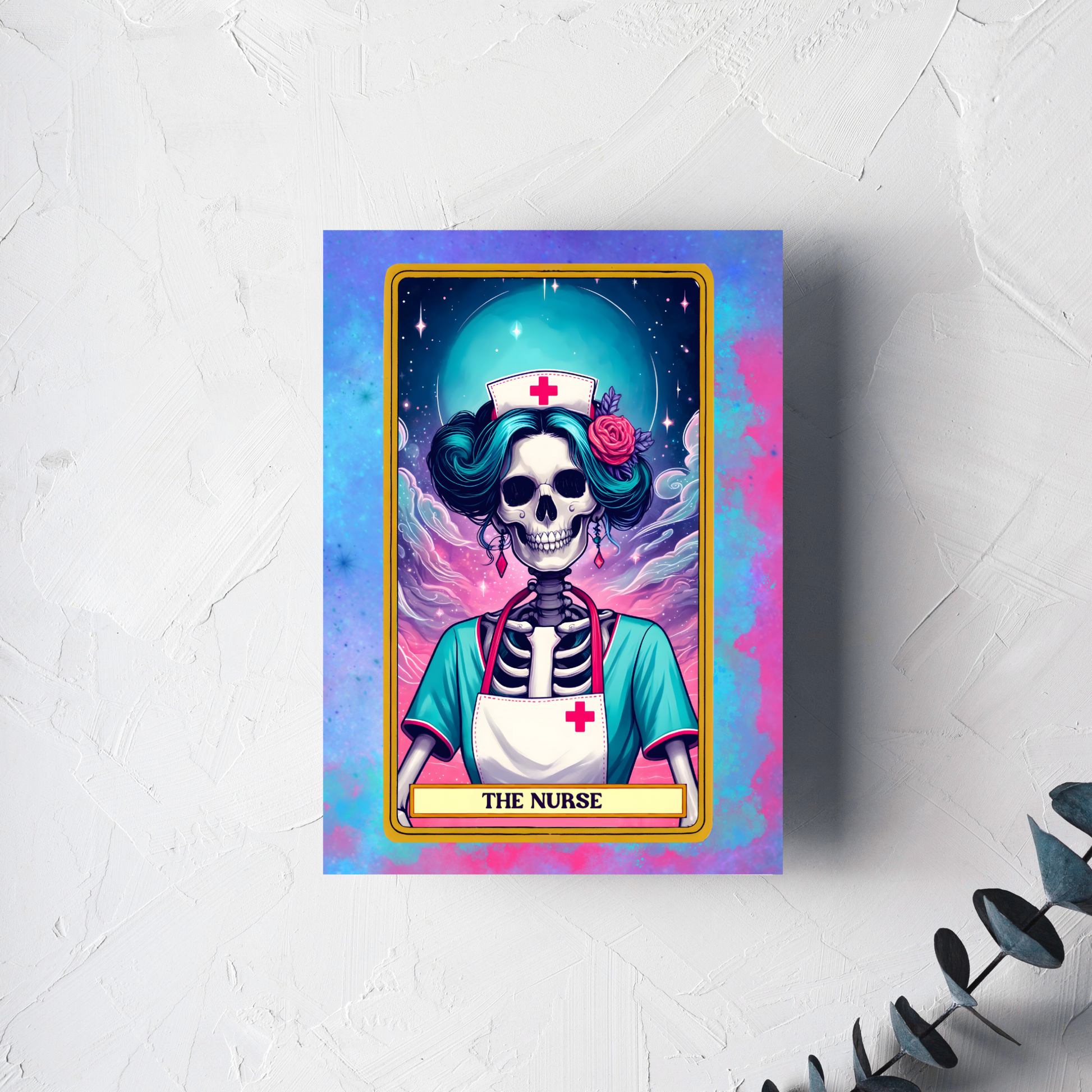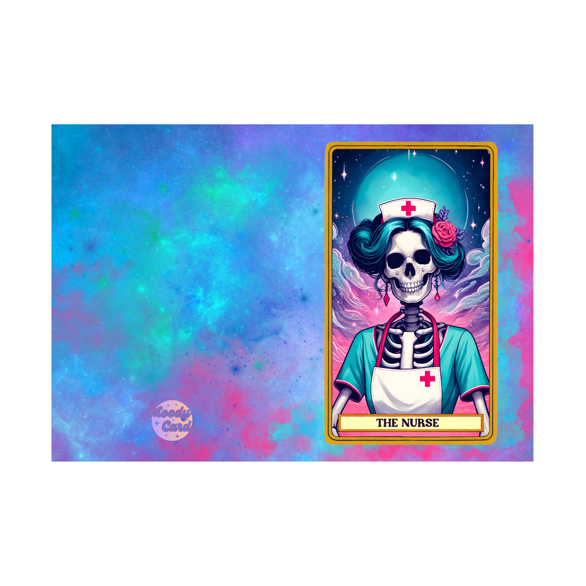 Celebrate the true hero in your life with our enchanting "The Nurse" greeting card. This vibrant 5x7" card features a stylish skeleton figure dressed in a classic nurse's uniform and cap, with a single pink rose tucked into her blue, vintage-inspired hair. The design is set against a mystical, celestial background with a glowing moon, all framed by an elegant, gold-trimmed border with a gothic flair.