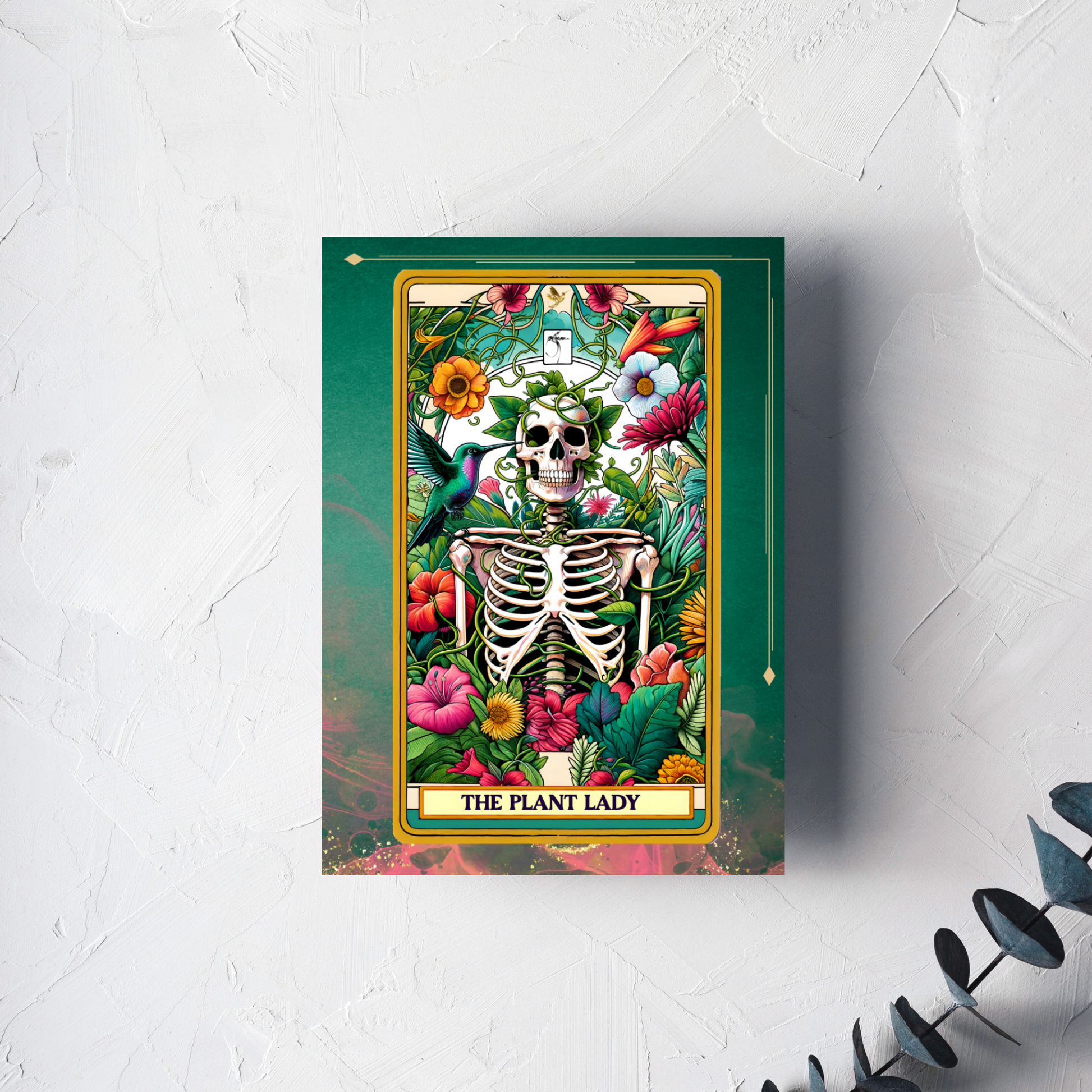 Celebrate the green thumb in your life with our enchanting "The Plant Lady" greeting card. This vibrant 5x7" card features a stylish skeleton figure, gracefully entwined with and surrounded by a lush, magical garden of blooming flowers, tropical leaves, and a hovering hummingbird. The design is set against a dark green background with a gold-trimmed border, creating a powerful and beautiful image of life flourishing even in death.