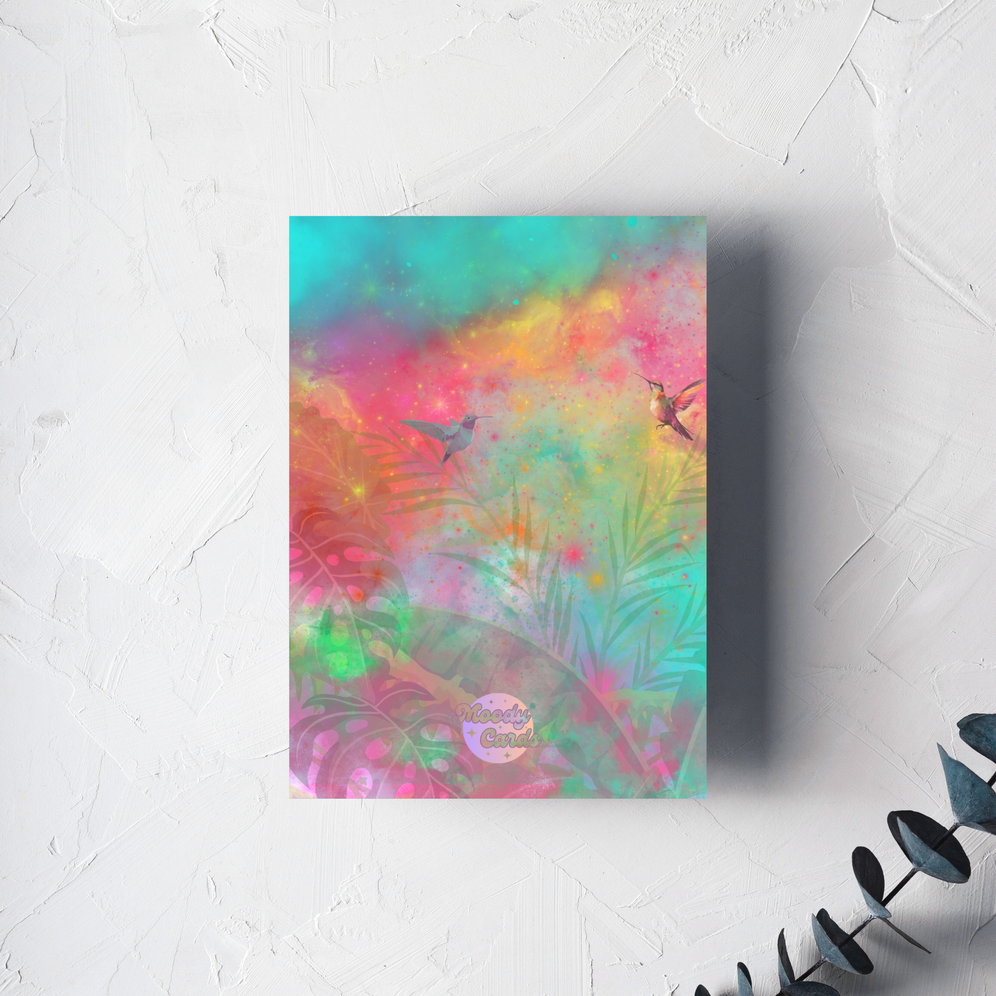 Celebrate the green thumb in your life with our enchanting "The Plant Lady" greeting card. This vibrant 5x7" card features a stylish skeleton figure, gracefully entwined with and surrounded by a lush, magical garden of blooming flowers and tropical leaves. The design is set against a bright, colourful background with a gold-trimmed border, creating a powerful and beautiful image of life flourishing even in death.