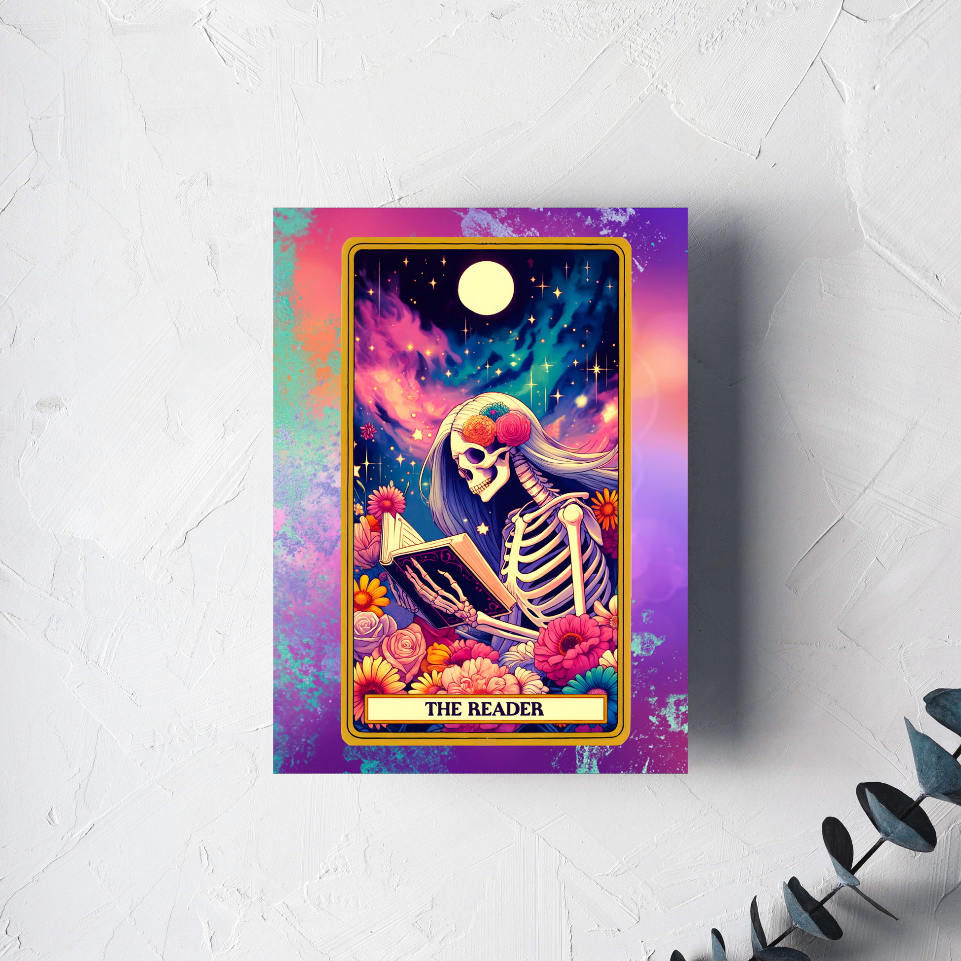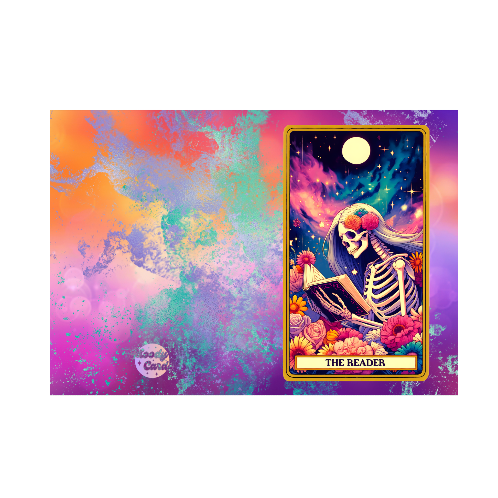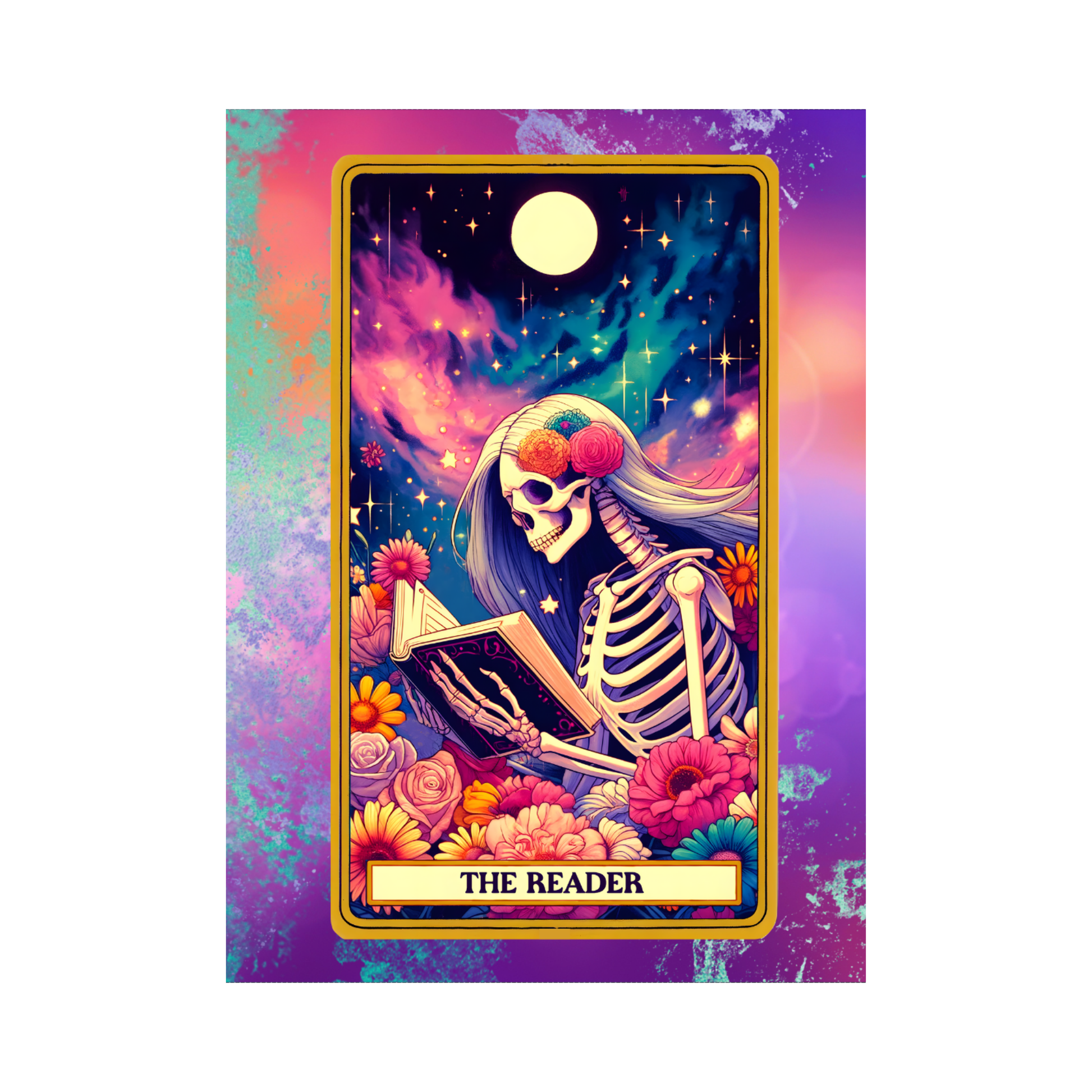 Celebrate the book lover and the magic of a quiet moment with our enchanting "The Reader" greeting card. This vibrant 5x7" card features a peaceful skeleton figure with flowing hair, adorned with flowers, and surrounded by a magical garden of blooming roses and daisies. The figure is immersed in a book, set against a stunning cosmic background with a full moon and glowing stars.