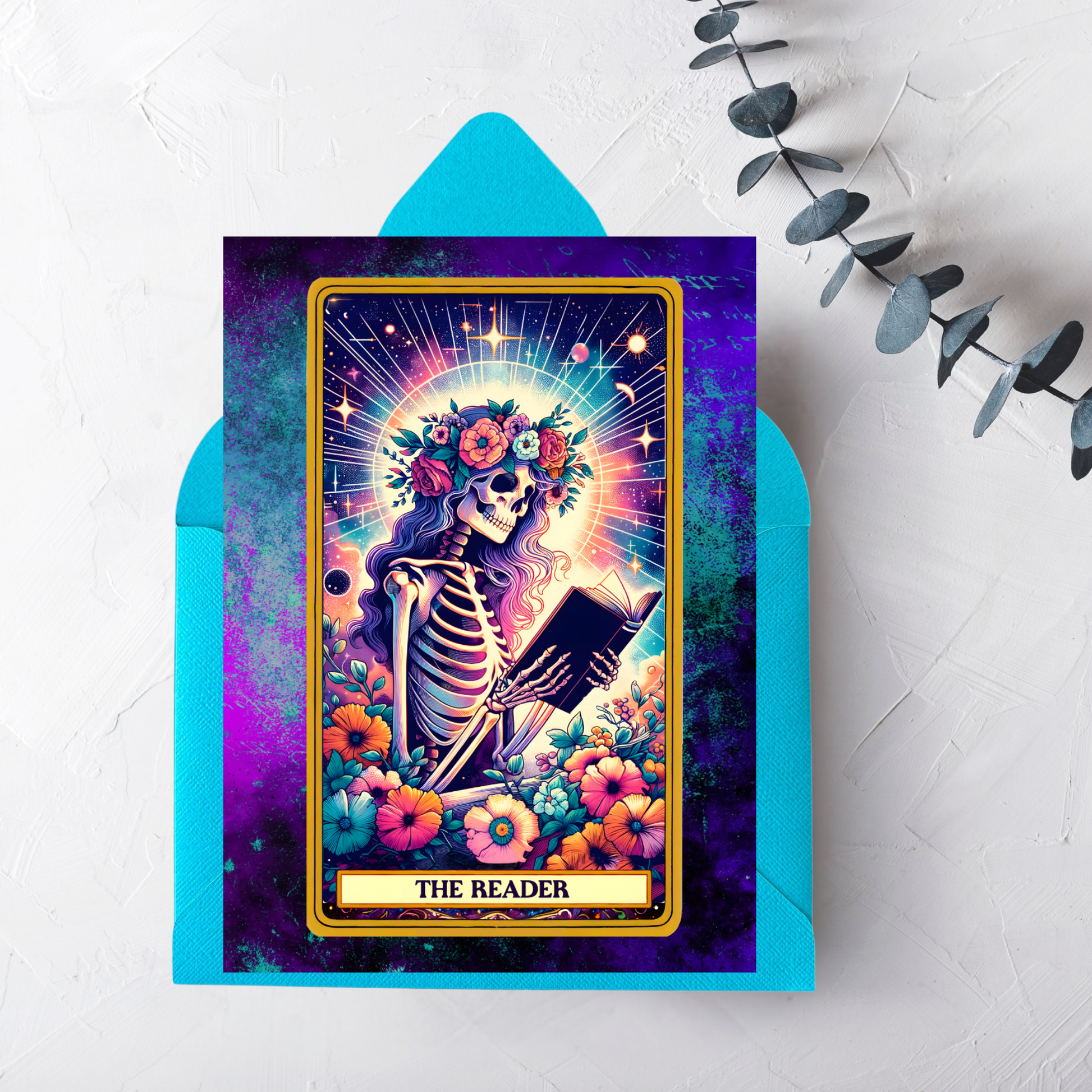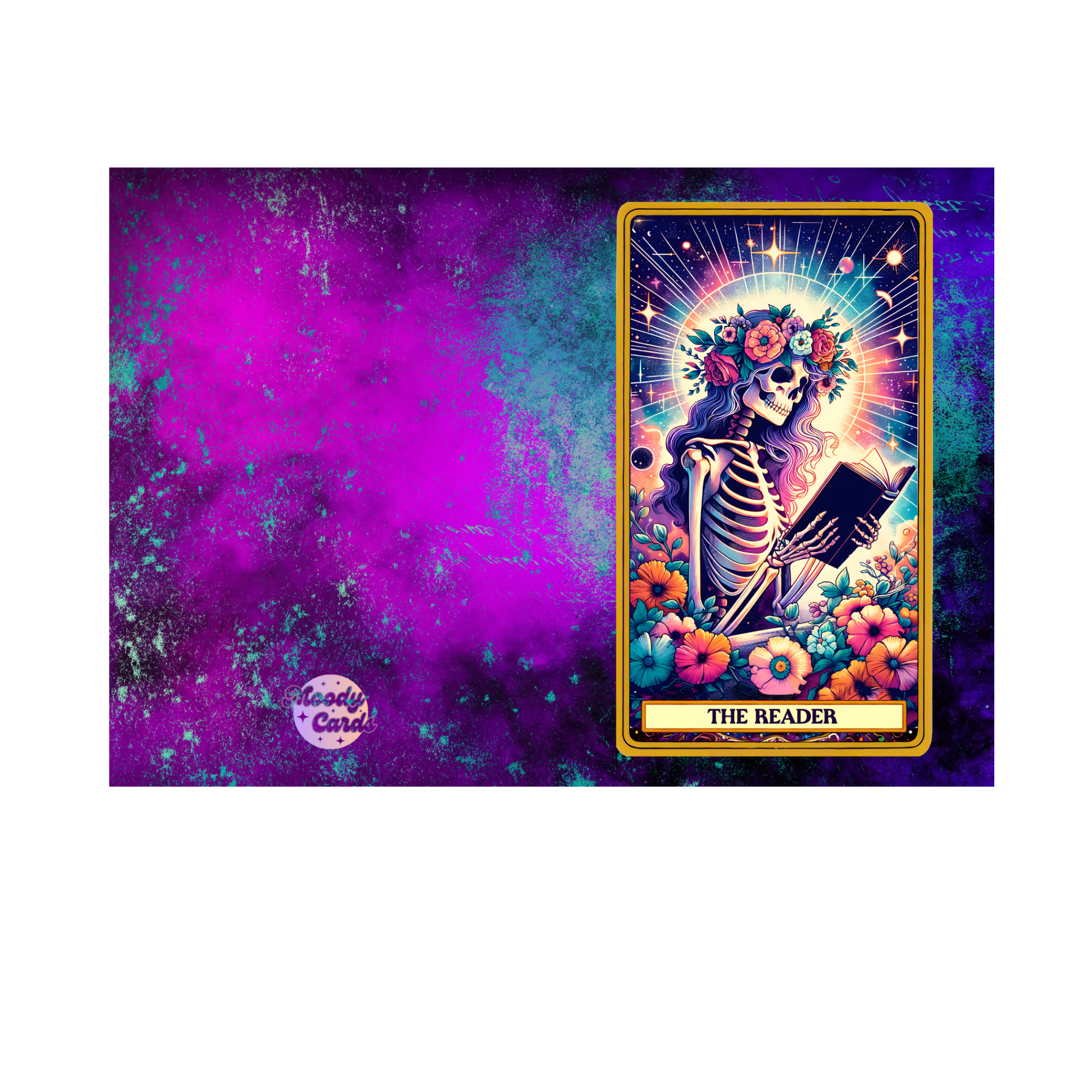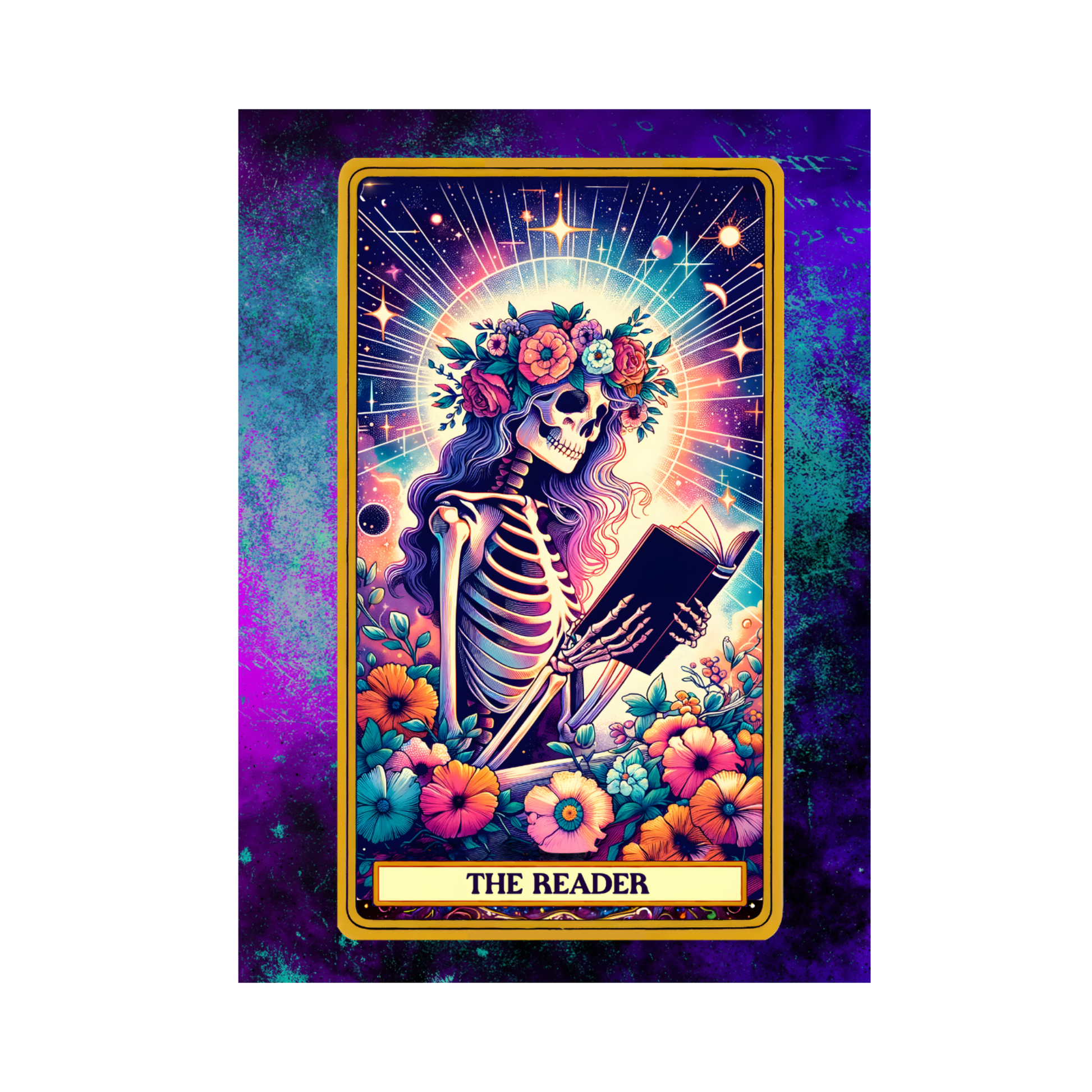 Step into a world of cosmic enchantment with our unique "The Reader" greeting card. This striking design captures a moment of quiet contemplation, featuring a skeleton with long, flowing purple hair and a vibrant floral crown. Cradling a book under a radiant sun-like halo, this figure embodies a blend of life, death, and profound knowledge.