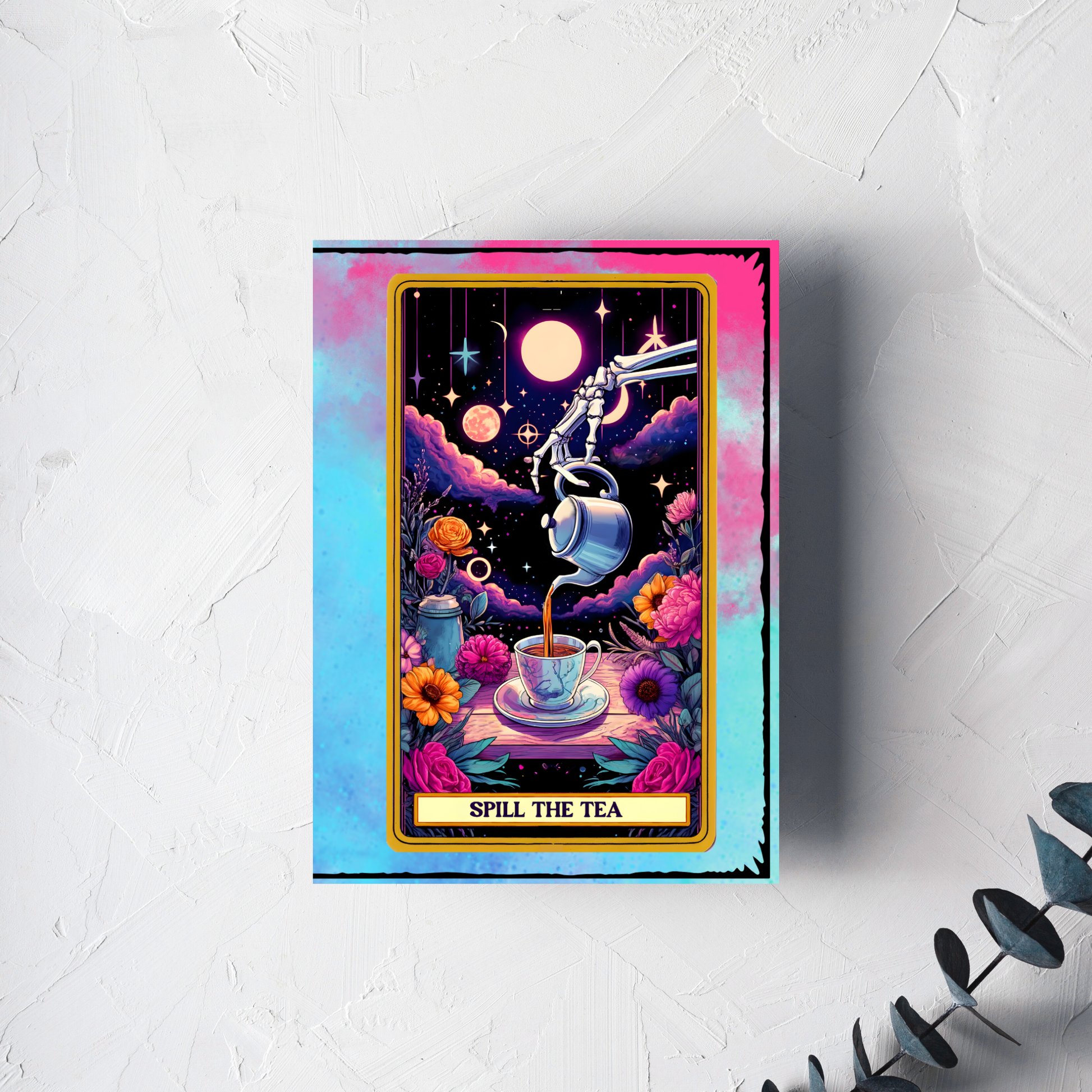 Time for a chat! Our "Spill the Tea" greeting card is the perfect way to invite a friend to a magical and gossip-filled get-together. This vibrant 5x7" card features a whimsical skeleton hand pouring tea from a teapot into a teacup, surrounded by beautiful, blooming flowers and set against a vibrant, mystical background with stars and a glowing moon.
