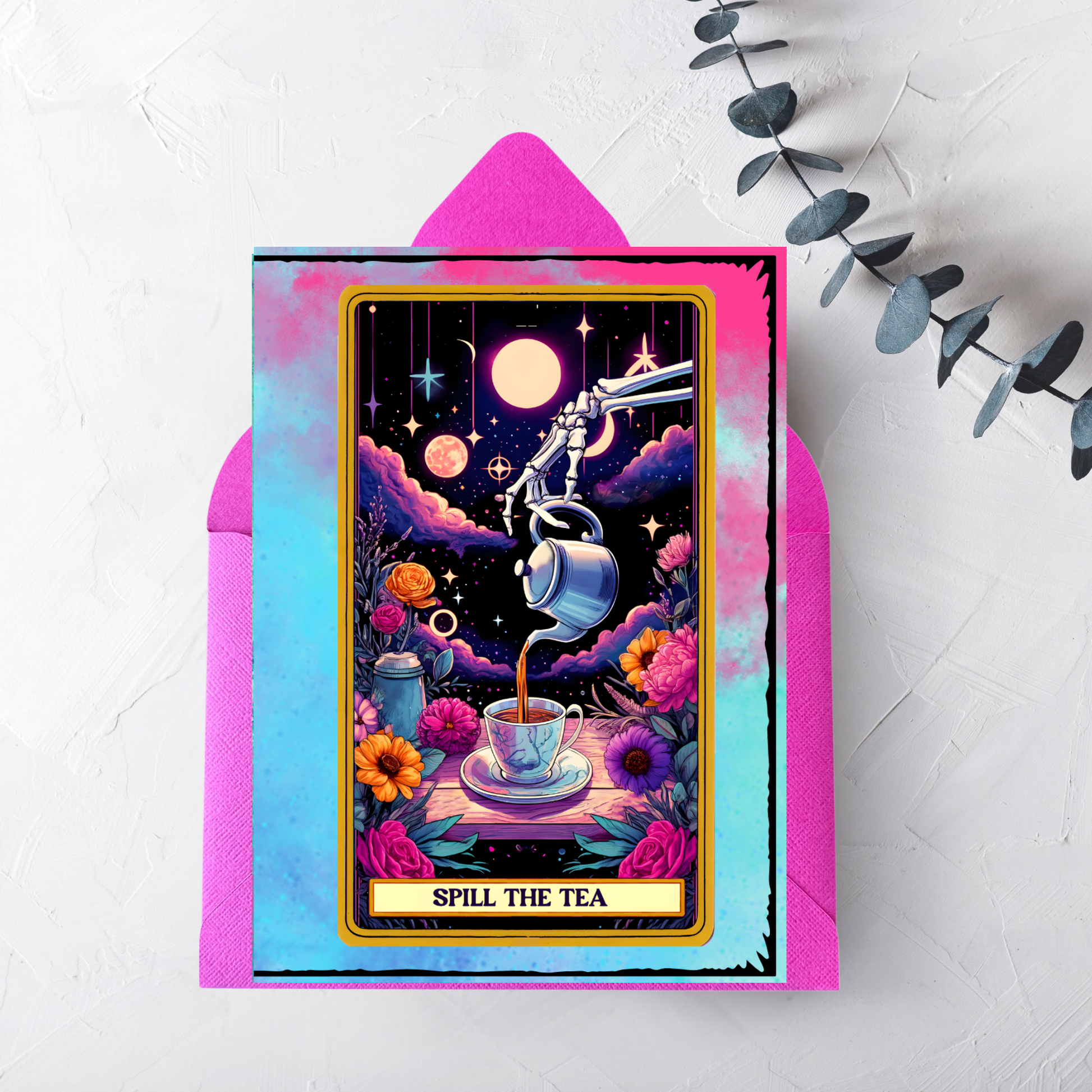 This card is a fun, unique, and quirky way to reach out to a friend. It's a delightful blend of the macabre and the magical, making it an ideal choice for a tea lover, a gossip partner, or anyone who appreciates a card with a bit of personality.